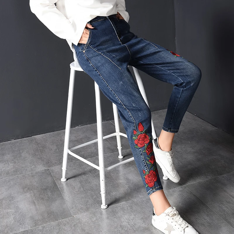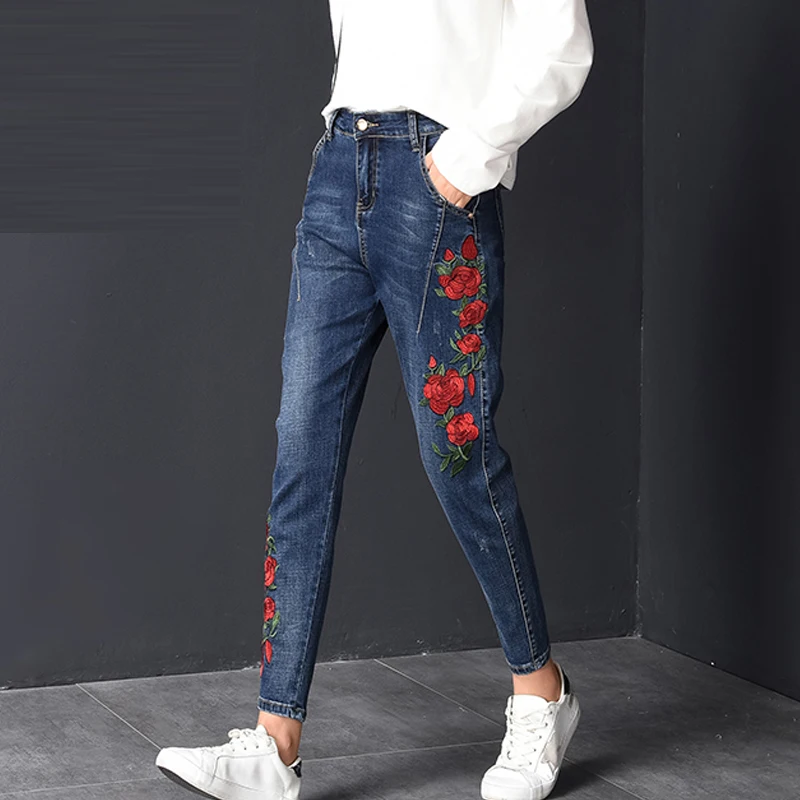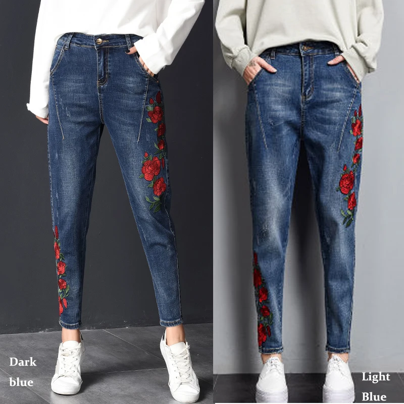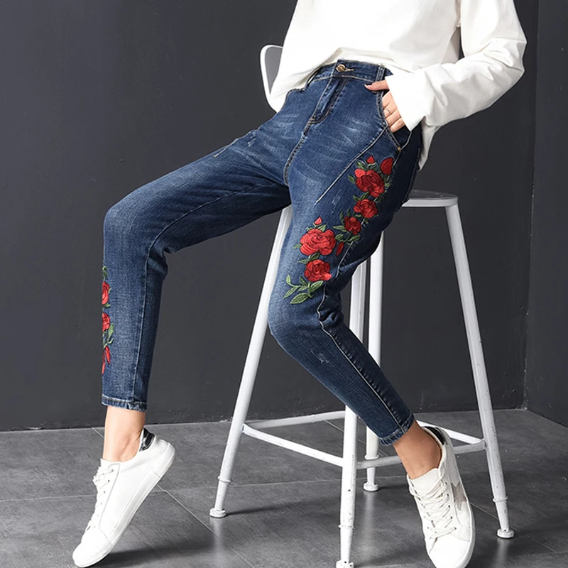 discount LXUNYI Fall Floral Embroidery Ladies Harem Jeans Pants Women Large Size Jeans Female Ankle Korean F